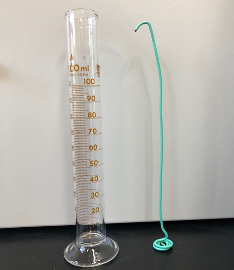 希釈するための道具はこれ、メスシリンダーとかき混ぜ棒です。かき混ぜ棒はお風呂のお湯を混ぜるやつ(湯かき棒と言うそうです)のミニチュアのようなもので、針金で自作。このメスシリンダーに線虫懸濁液を入れて希釈します。例えば懸濁液を入れて水を足して100mlにし、かき混ぜ棒で混ぜて均質にし、1ml取ってその中の線虫を数えるわけです。複数回数え、希釈倍率(この場合は100倍)をかけると元々の線虫数が推定できます。