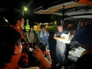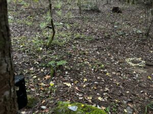 結果としては3日間とも雨を伴う悪天候で、対象としていたニホンジカの捕獲を行う事が出来ませんでしたが、トレイルカメラに補足された映像と罠の反応から確かに動物が活動している事を実感できました。フィールドの調査と夜間の気配・自分らが関わった罠の近くでの鳴き声など、リアルな空気を感じることで、知識だけの対策ではなく野生動物の行動原理にも意識が向いた森林技術者に育ってもらいたいと思います。
