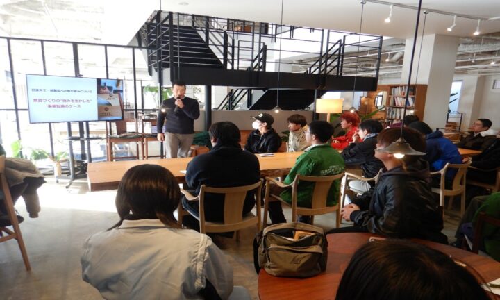 同社の北山社長にバレル事業の経緯など沢山のことをレクチャーしてもらっている生徒達