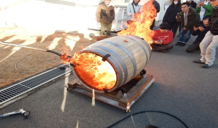 他にも樽の中身をチャーリングにする貴重なところを見学できました。チャーリングは、樽の内側を直火で焦がしバニラやアーモンドなどの香りを生成し木香を抑えることです。チャーリングの程度は4段階に分かれていて、オーダー先の要望に合わせて行っているそうです。チャーリングの迫力に生徒たちも大興奮の様子でした。