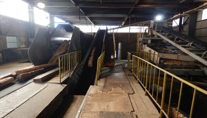 実際にチップの製造ラインの一部を見学させてもらいました。原料となる丸太の皮剥きをし、刃物がついた裁断機で丸太を刻みます。次にふるいにかけて粗さをそろえチップを製造します。この裁断とふるいの工程を繰り返し、天然乾燥を経て出荷されます。