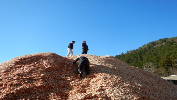 乾燥中チップの山にのぼる生徒たち