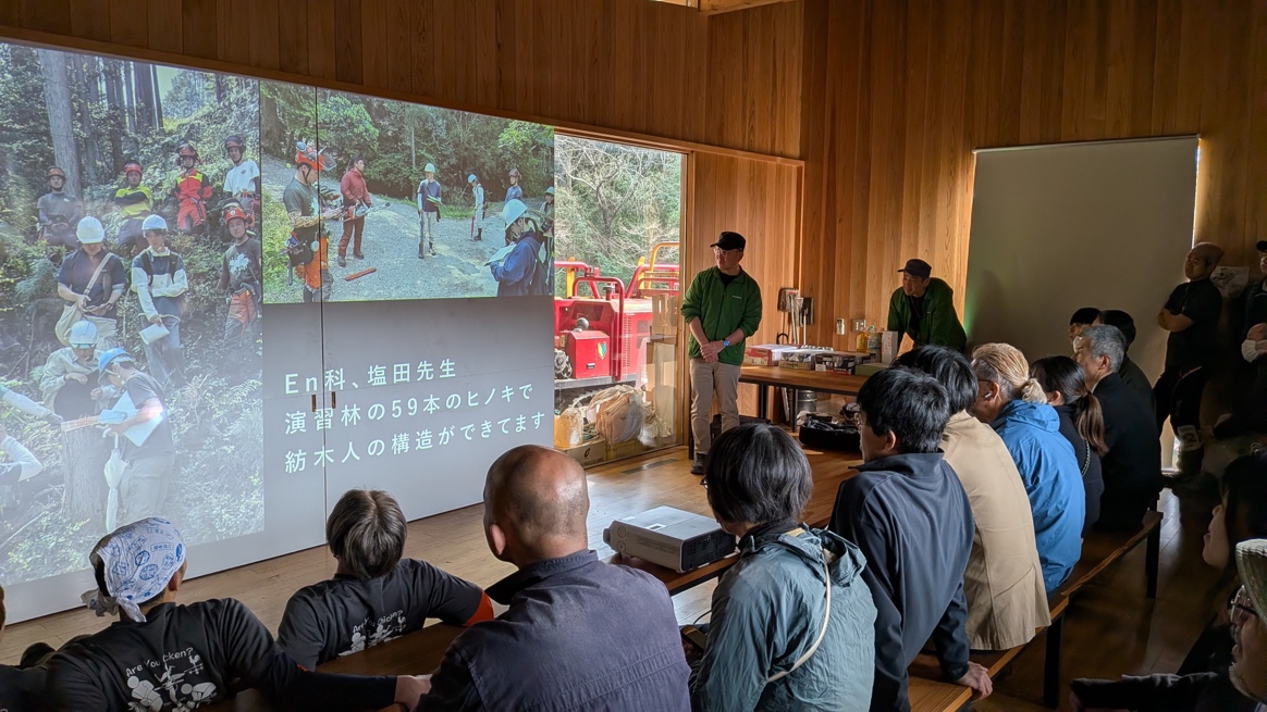 奥村さんは「私が(ハウスメーカーで)働いていた時には自分が住宅をつくるのに使う木材を誰が切っているかさっぱり分からなかったけれど、今回は切った人たちが誰かというのを感じながら建築をつくれたことはありがたいと思っています」と話し、演習林から切り出された木の中でも特に素性がいい木材を使わせてもらっていることに感謝し、構造材に使用された木材の歩留まり率についても紹介。「柱や方杖のどの面を正面に向けるか、どの材を柱に使うのかを1本1本決めてつくっています。この建築の全部の場所で一緒に関わってくれた人たちが思い出され、この土地の各所で人の顔が浮かぶ建築をみんなでつくることができてうれしい。『紡木人』は名前に『人』を入れていて、人が入って完成する建築だと思っているのでたくさん使ってもらって建築も私たちも土地全体で育っていけるように願っています」と締めくくりました。