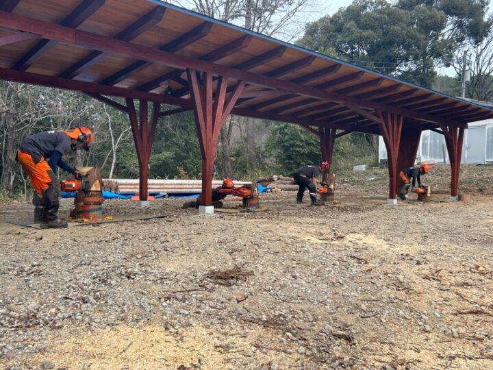 竣工式では、棟梁の奥村千里さんが編集してくれた「紡木人」の紹介動画を鑑賞した後、伐倒競技を開催。エンジニア科2年の杉村光香さん、安江海人さん、同科1年の林宏幸さん、山田陽介さんの4人がチェーンソーを握って本番同様に15m先の的に狙いを定めて丸太に受け口を作ります。なんと、杉村さんは誤差なく的に向けて受け口を作っていました!