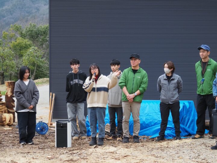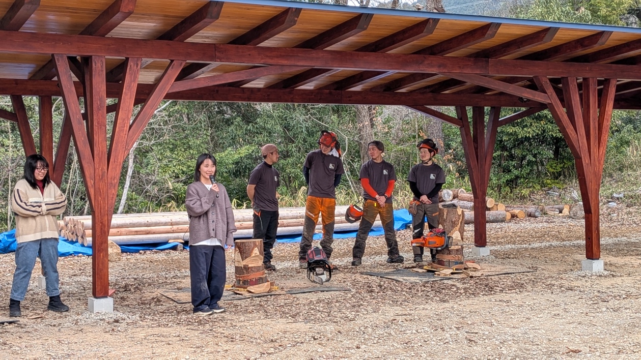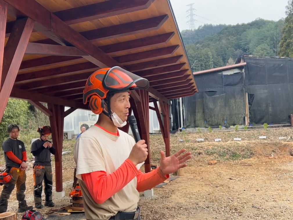 杉本准教授は「昨年度の卒業生が演習林で伐採した木がここで使われています。林業で木を切っても、製材して建物で使ってくれる人がいないと林業は役に立ちません。いろいろな繋がりがあっての林業だと思います。演習林があるのは(アカデミーの前身の)林業短期大学校の人たちが木を植えて育ててきたから。そういう繋がりのなかで仕事をしているという思いを引き継ぎながらここで学生たちが練習して、安全に木を切って、山で仕事ができる人を育てられるような施設にしていきたい」とあいさつ。