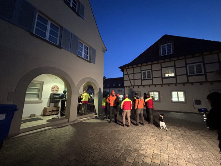 今回は100人規模の巻き狩りです。射手と勢子(Treiber)に割り当てられ、射手はHFRの2年生や地域のフォレスター&ハンターから構成されおよそ60人がハイシートに待機します。勢子は1年生が中心となっていることもあり、アカデミーにも来校してくれたバイムグラーベン教授から改めて諸注意が案内されていました。