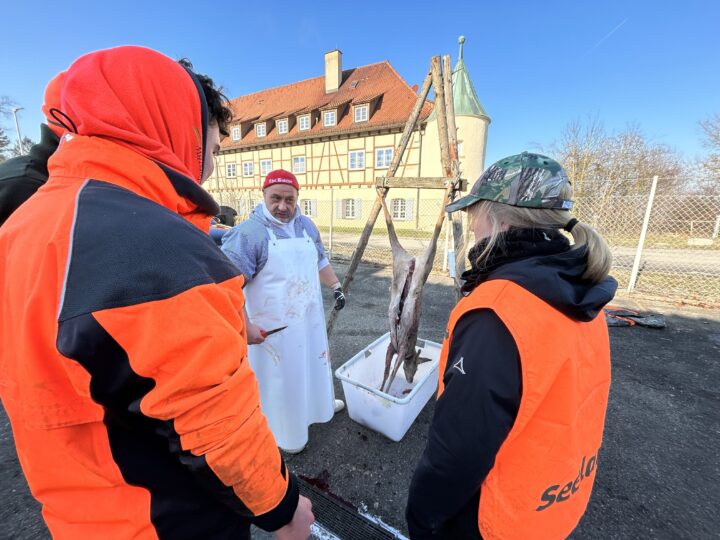 HFRではチュービンゲンからブッチャー(肉屋)を呼び、1週間滞在してもらいながら捕獲した個体の解体とパッケージを行うそうです。解体はブッチャーだけでなく先輩学生やフォレスターに教えてもらいながら1年生もチャレンジです。内臓の観察で健康状態の確認をしたり、歯列から年齢を計測したりと学びながらの解体です。バイムグラーベン教授いわく、経験者と初心者が混ざり学び会いながら経験していくことが重要なのだと。