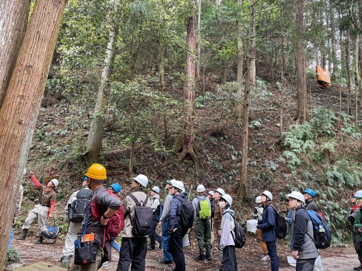 さらに歩いていくと、山の神がまつられている場所に到着しました。そこではヒノキの高齢林や大きな杉(アカデミーでは大杉とよばれています)を見学しました。長い時間をかけて育った木々の迫力に圧倒されながら、森の時間の流れを感じます。