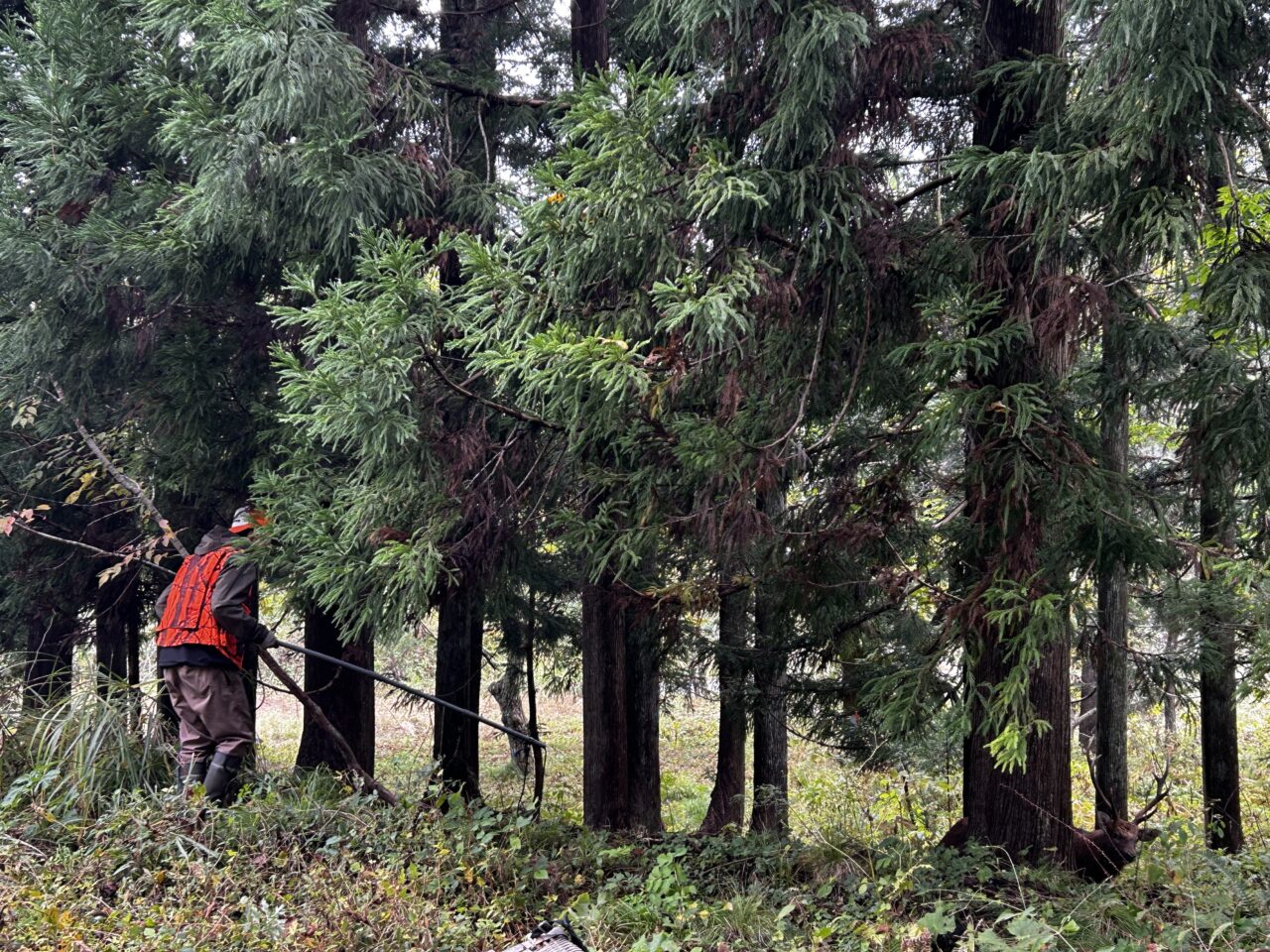 見回っていると。。。ある個所にかなり大きいオスジカが罠にかかっていました。あまりの大きさに水上さんも、それまでとは違った雰囲気を見せ、帽子を深く被られました。あのとき、瞳の奥が深くなられていた気がします。