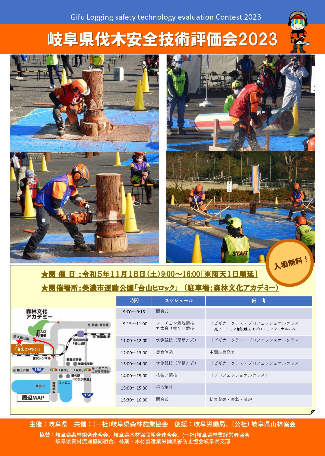11/18(土)(雨天の場合は19(日))に美濃市運動公園「台山ヒロック」(森林文化アカデミー横のグランド)で林業に必要なチェンソーの技術を競う「岐阜県伐木技術評価会」が行われます。