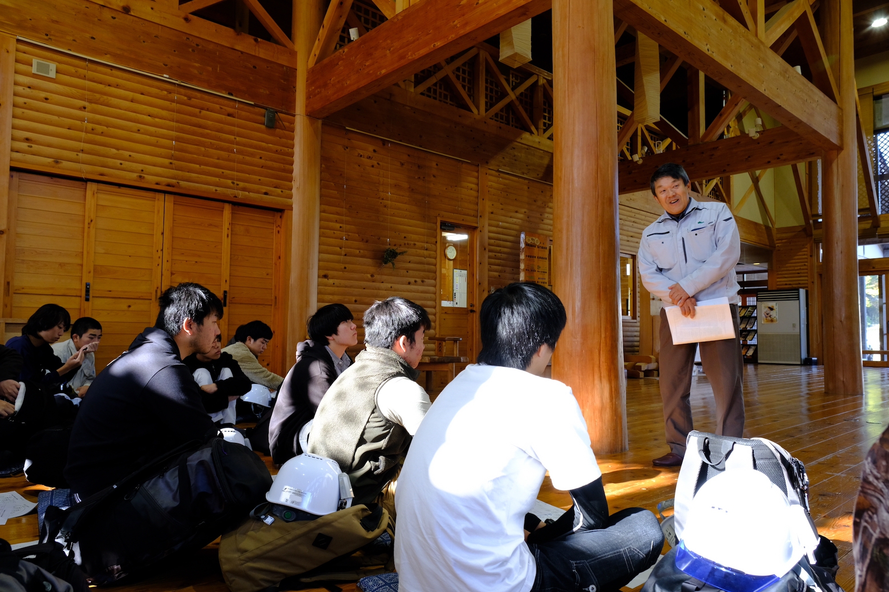 見学後,宿泊先の「かしもふれあいのやかた」で,夕食も兼ねて地元の林業事業体の職員らと懇親会を行いました。この懇親会には本学の卒業生も参加してくれました。いくつかの林業事業体は,企業説明会にもきていただいていますが,ざっくばらんな雰囲気のもとで,その時とはまた違ったお話を聞くことができ,とても良い機会となりました。明日のレポートもお楽しみに。