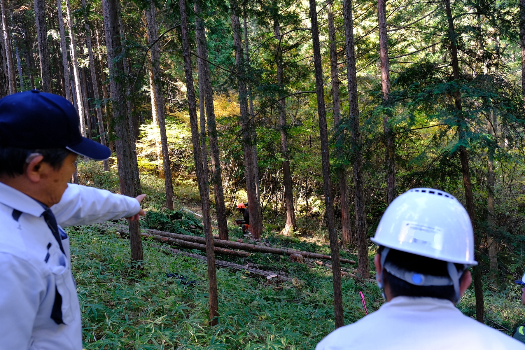 加子母の森づくりの特徴の一つは複層林です。そのため,樹冠の合間を縫ってワイヤも使いつつ,器用に木を倒していく作業を見学させてもらいました。また,この写真にも,細い木と太い木が映り込んでいるのが見て取れます。ある程度択伐して樹冠が空いたら,その下に苗を植栽するそうです。また,林縁でヒノキ実生が天然更新ている場合には,それらのうち形質の良いものを残して育てていくそうです。なかなか複層林施業をしている現場を目にすることがないので,とても貴重な機会となりました。