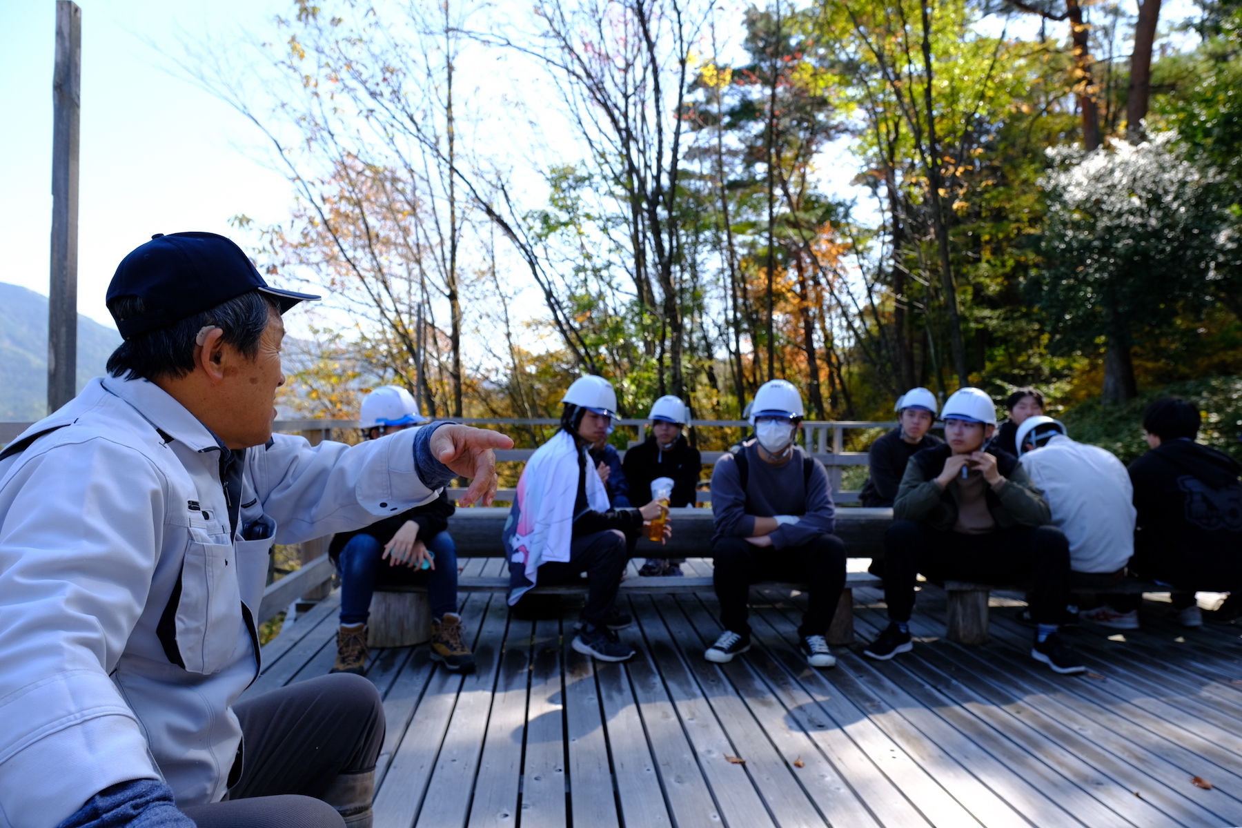 初日の今日は,朝7時にアカデミーを出発しました。まずは宿泊地の「かしもふれあいのやかた」で,研修内容や中津川市加子母の森林経営の特徴についての説明を受けました。解説していただいたのは加子母森林組合の組合長,細川さんです。