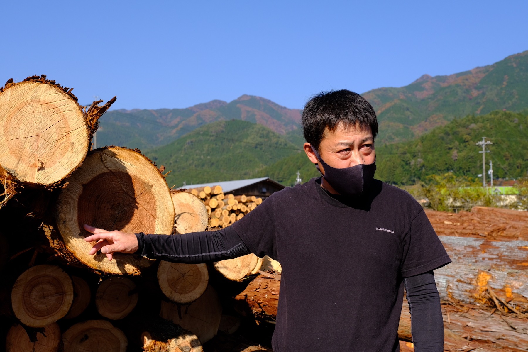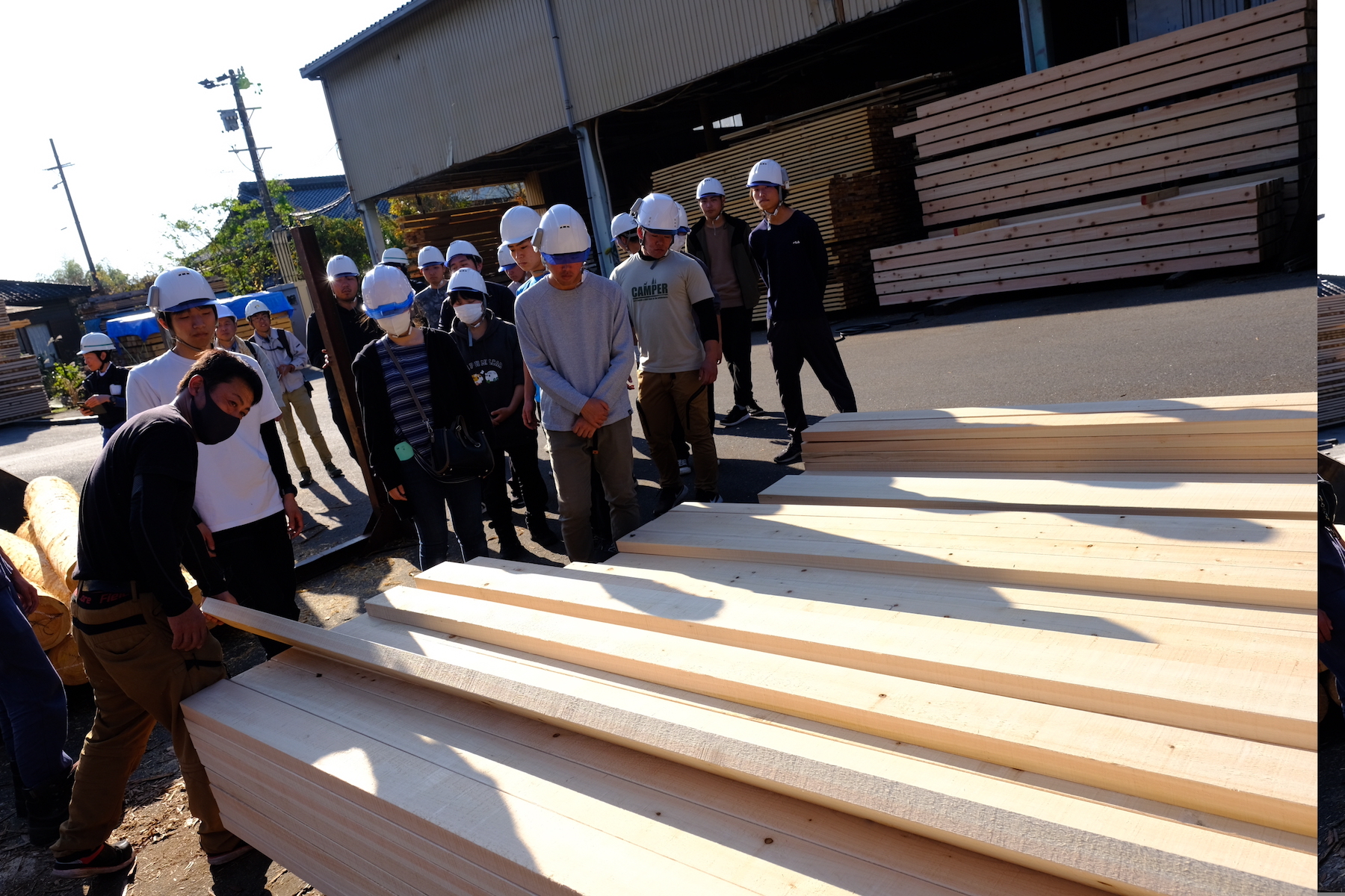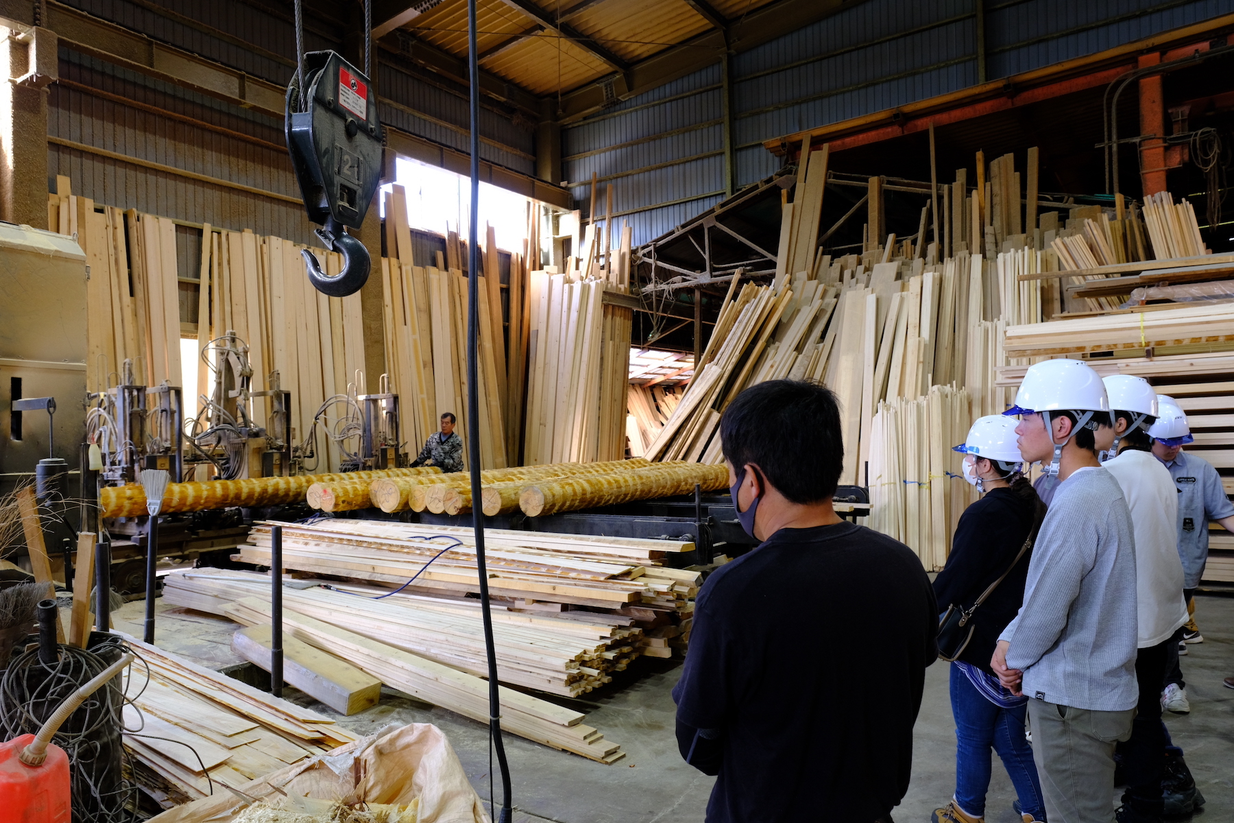 その後,梅田製材に移動し,丸太を柱に挽く様子を見学させてもらいました。丸太から柱材や板材にするときの歩留まりは50%程度だそうで。しかし,樹皮を含めた残りの部分も他業者に売ったり,自社の乾燥機のボイラの燃料にしたりして,全て活用できているとのことでした。ちなみに梅田社長は林短時代の本学のOBです。