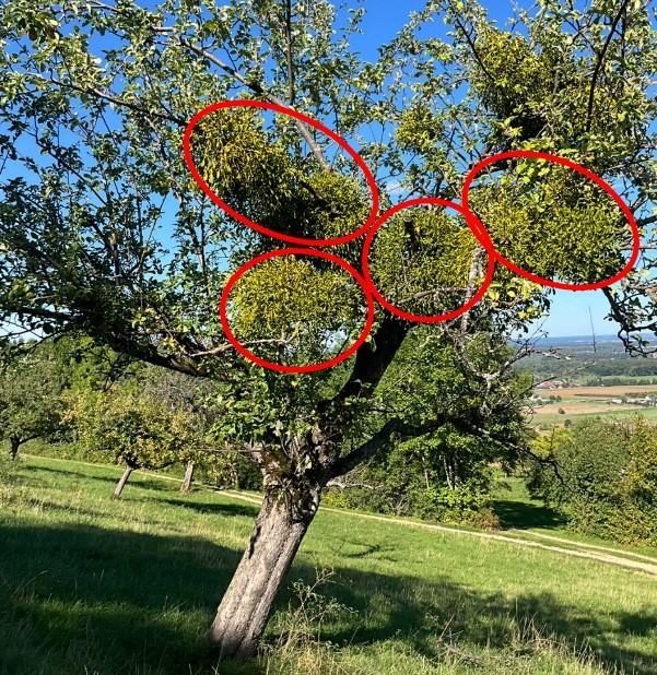 いくつものヤドリギに寄生されたリンゴの木(養分を吸われ枯れてしまう木も)