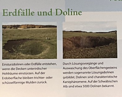 地下の石灰岩洞窟の天井崩壊による陥没穴と表面岩石の溶食によるドリーネ