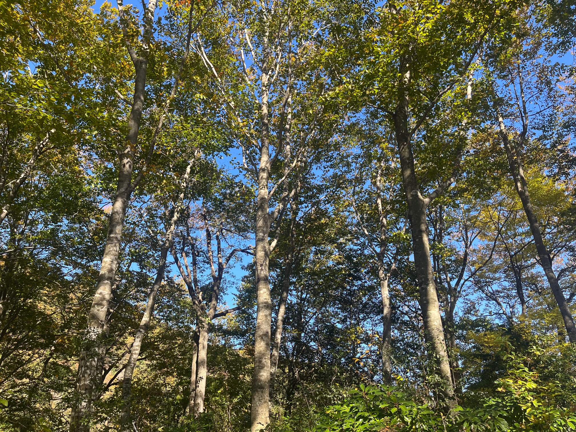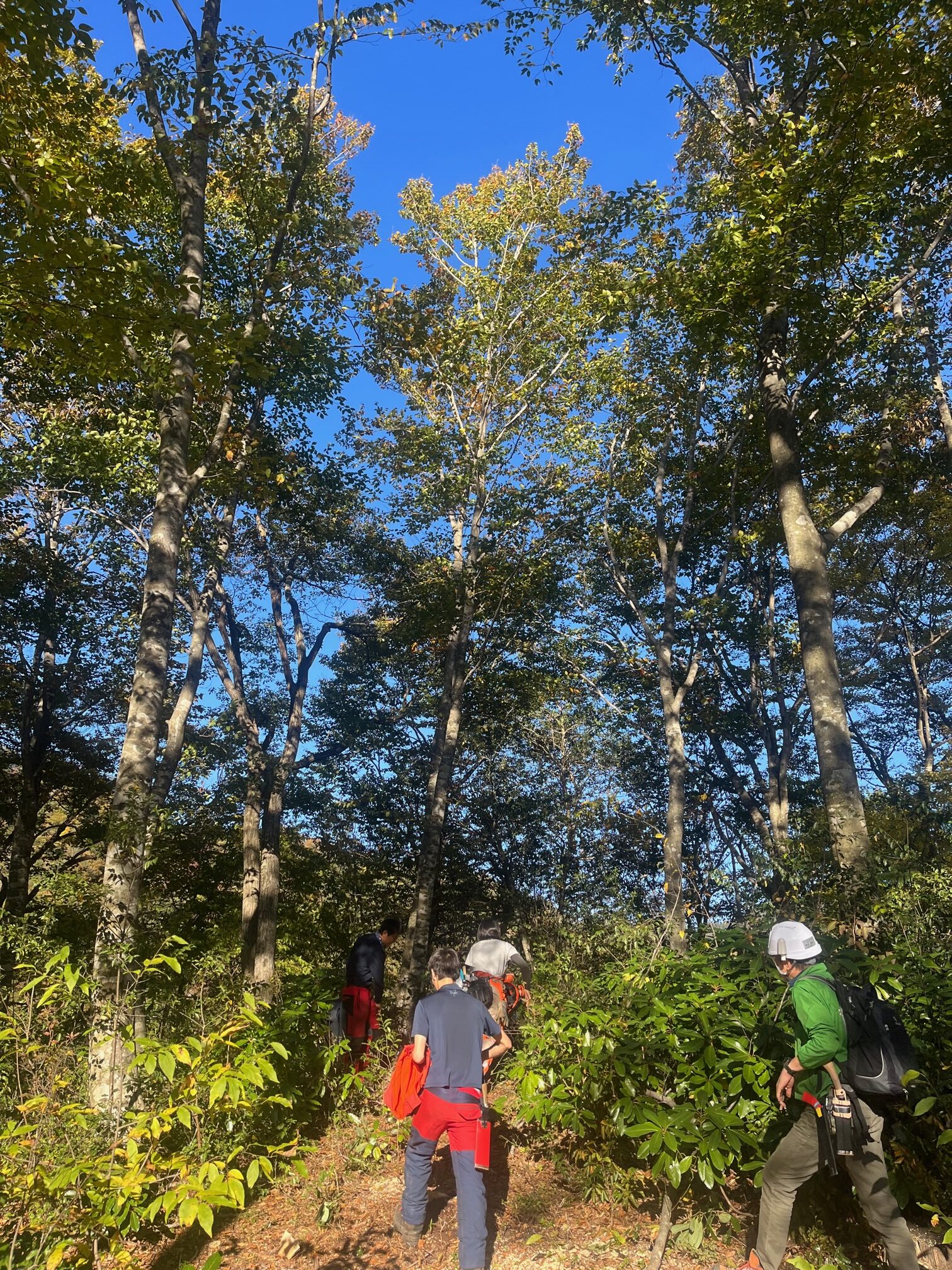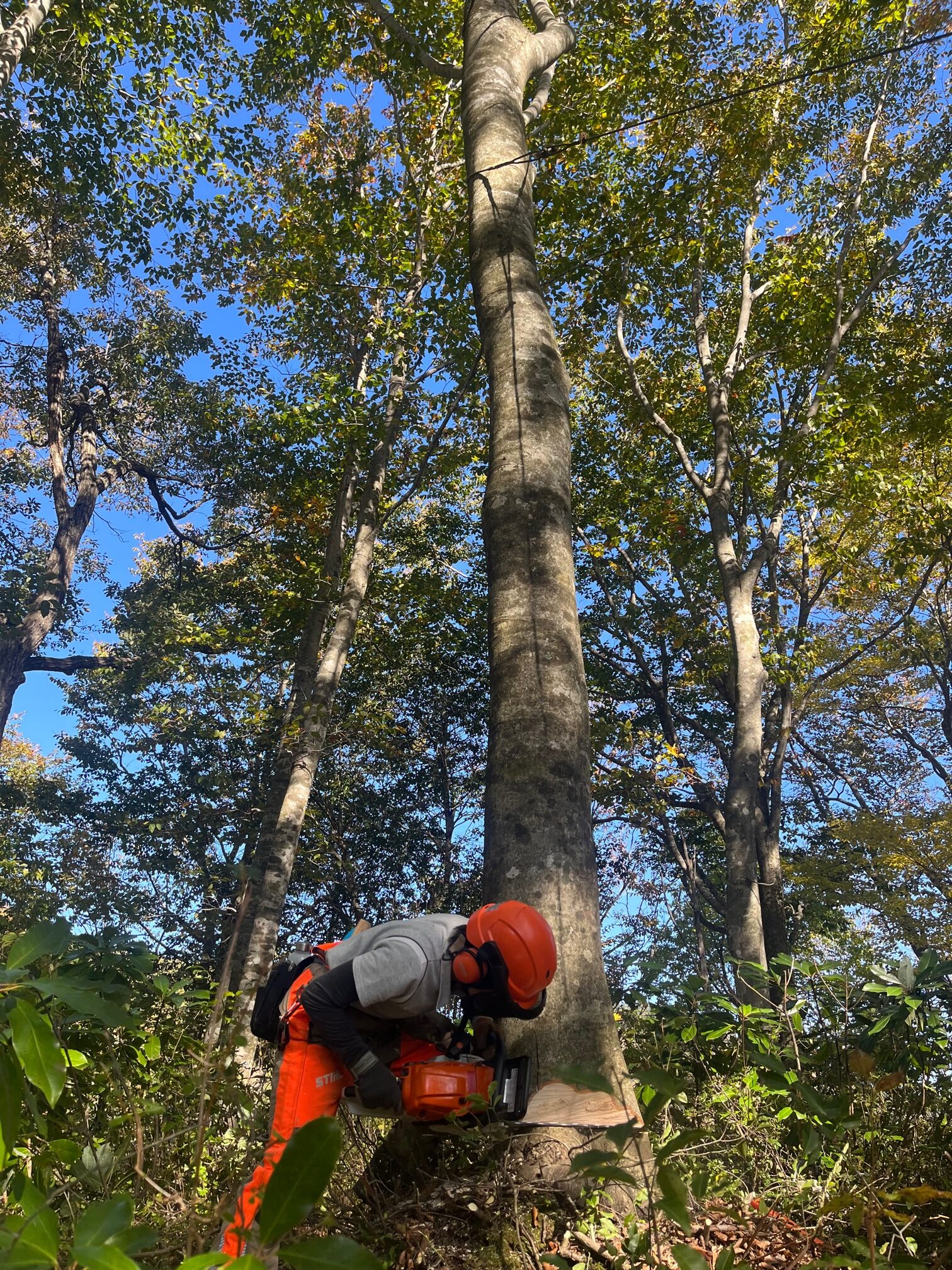 今回伐採することになったのは、真ん中のブナ。両サイドのブナの枝を伸長させて、肥大成長を促す狙いです。他にも複数のブナを選木しましたが、時間の兼ね合いで今回はこの木のみの伐採です。