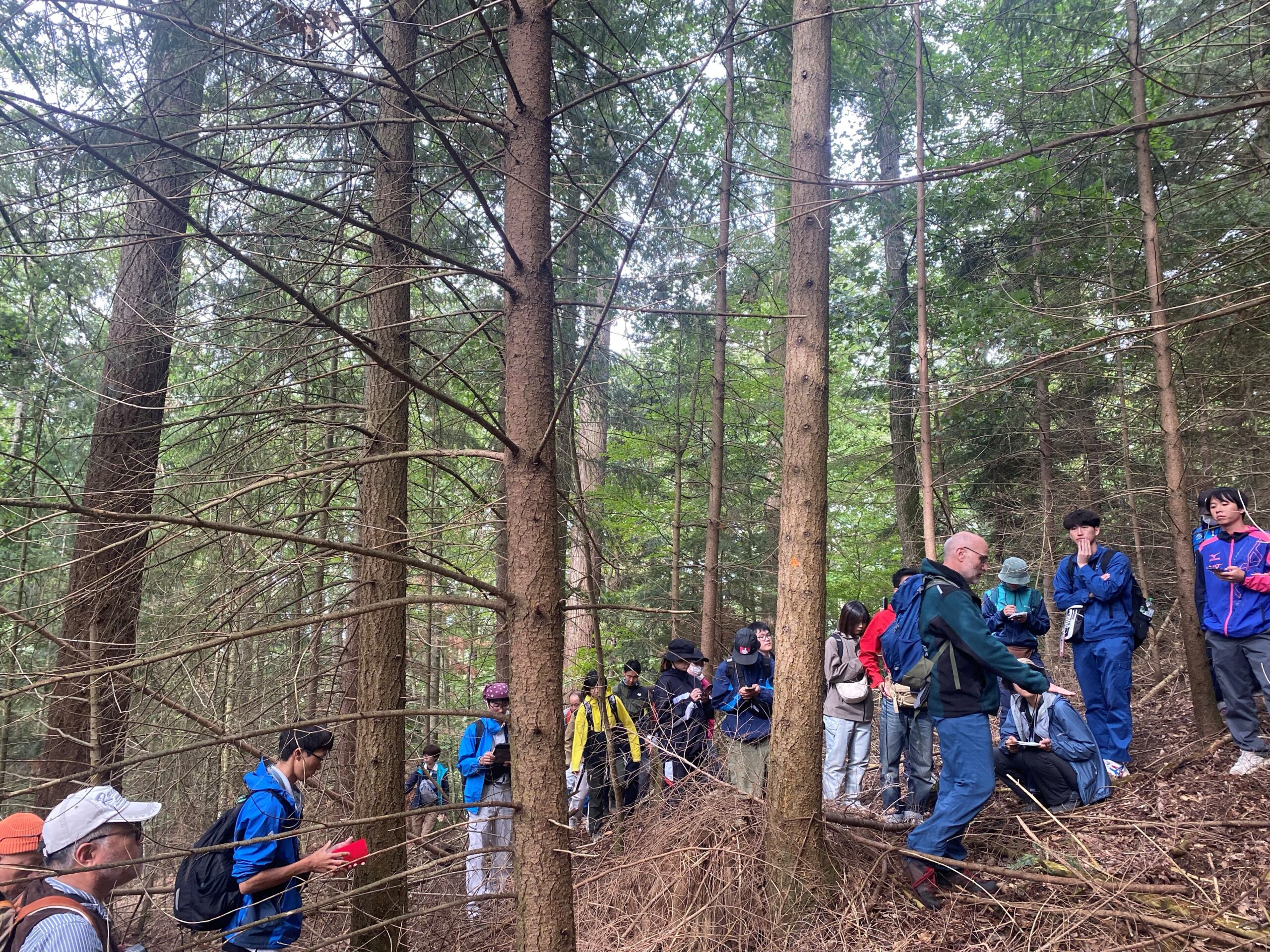 ダグラスファーの造林地では、100年生程度の大木の周りに、さまざまな年齢のダグラスファーが生えていました。こちらの造林地では、皆伐はせず、択伐しながら資源を利用しており、育成木は10m程度枝打ちをされていたり、しっかりと手入れされている様子が伺えました。