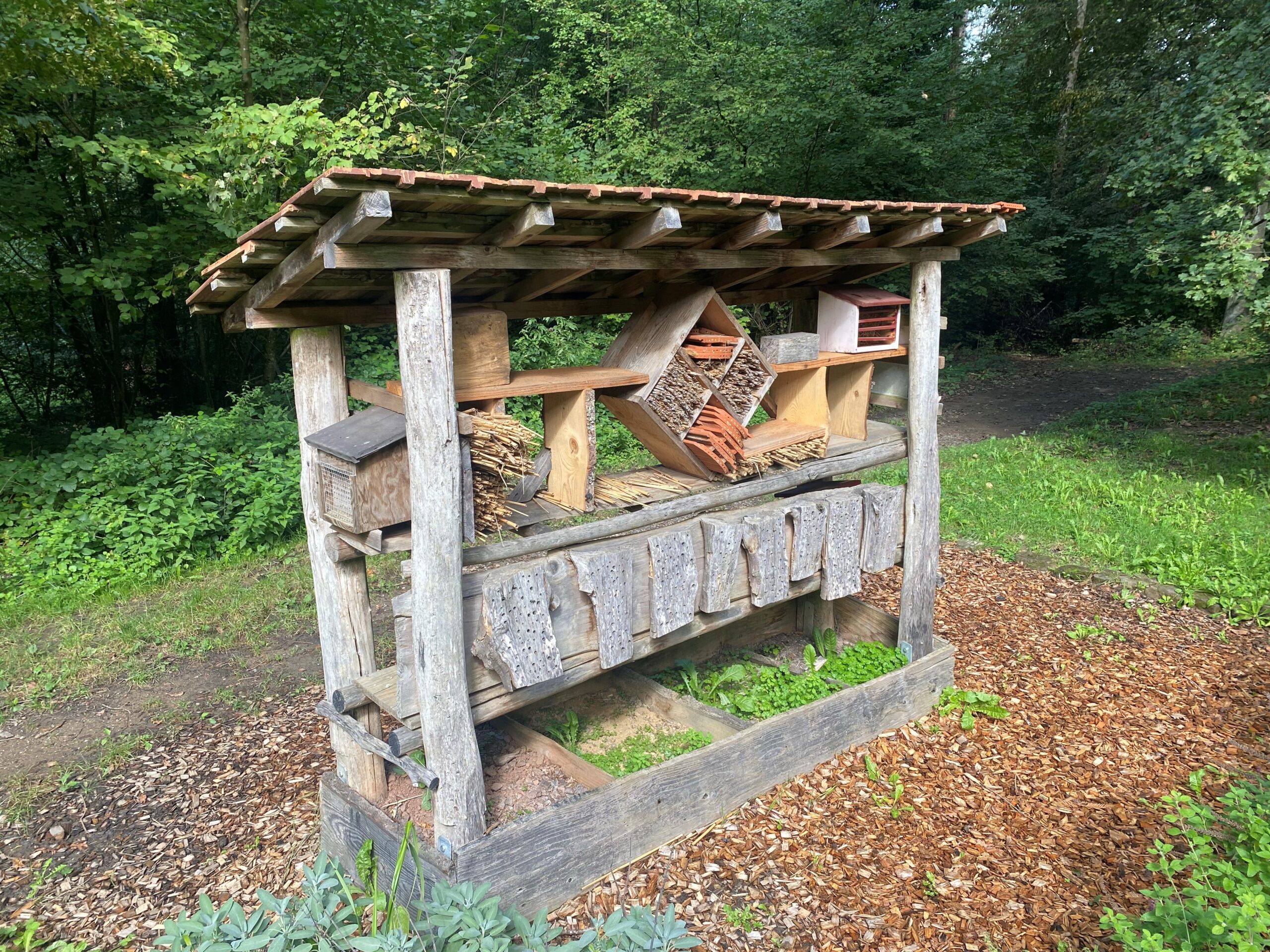 森の中には、子供たちが作った昆虫の住処(インセクトホテル)がありました。