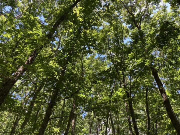 最後に見学した広葉樹林は樹冠の光景が美しく、上層木の樹高はかなり高く感じられました。ここでは、樹木の1本1本の間隔は5〜10mほどだということでしたが樹冠は閉じていて、それぞれの樹木が大きく広く枝を伸ばして葉をたくさんつけていることが分かり、広葉樹林の一つの理想型を見ることができました。