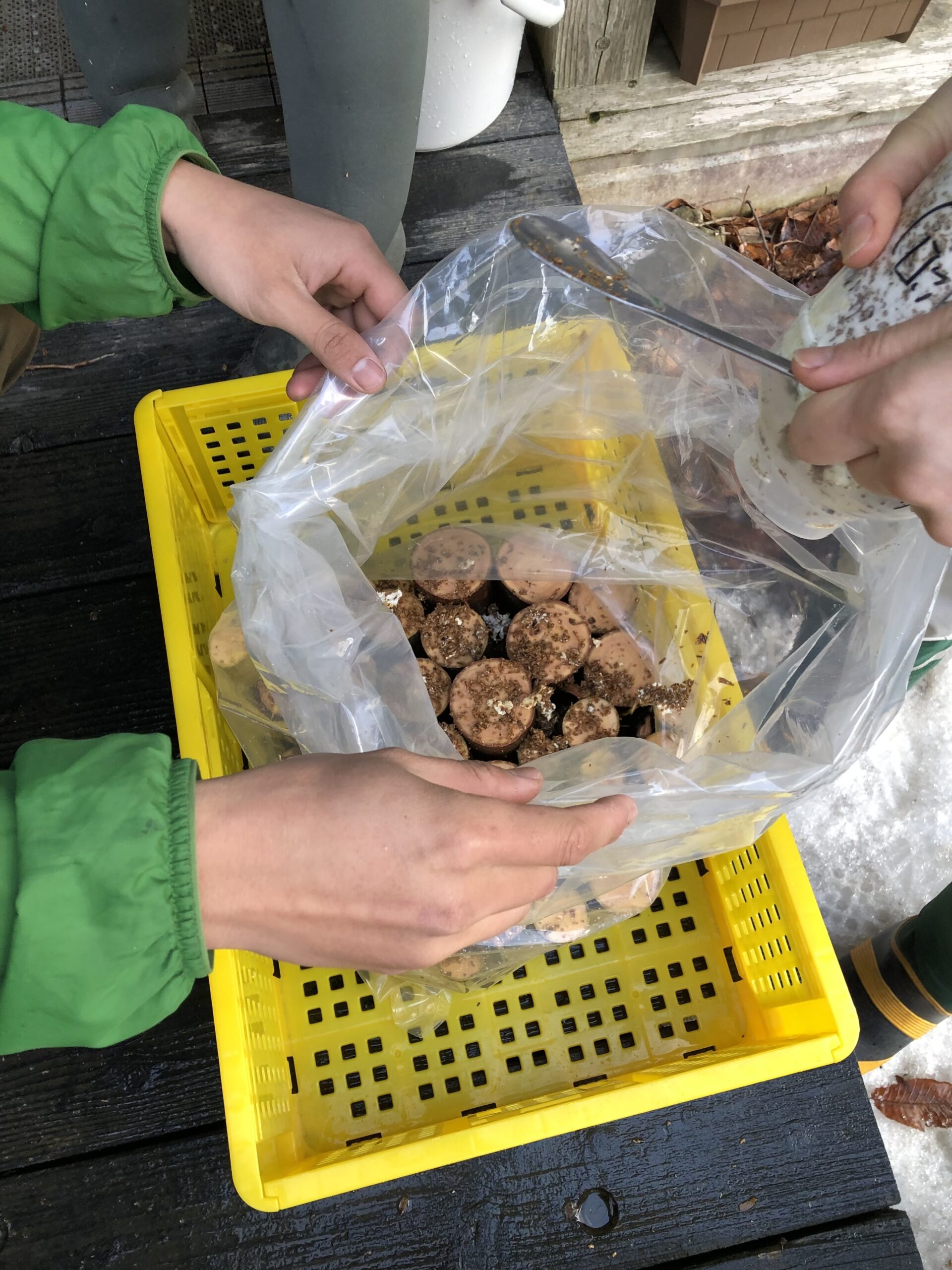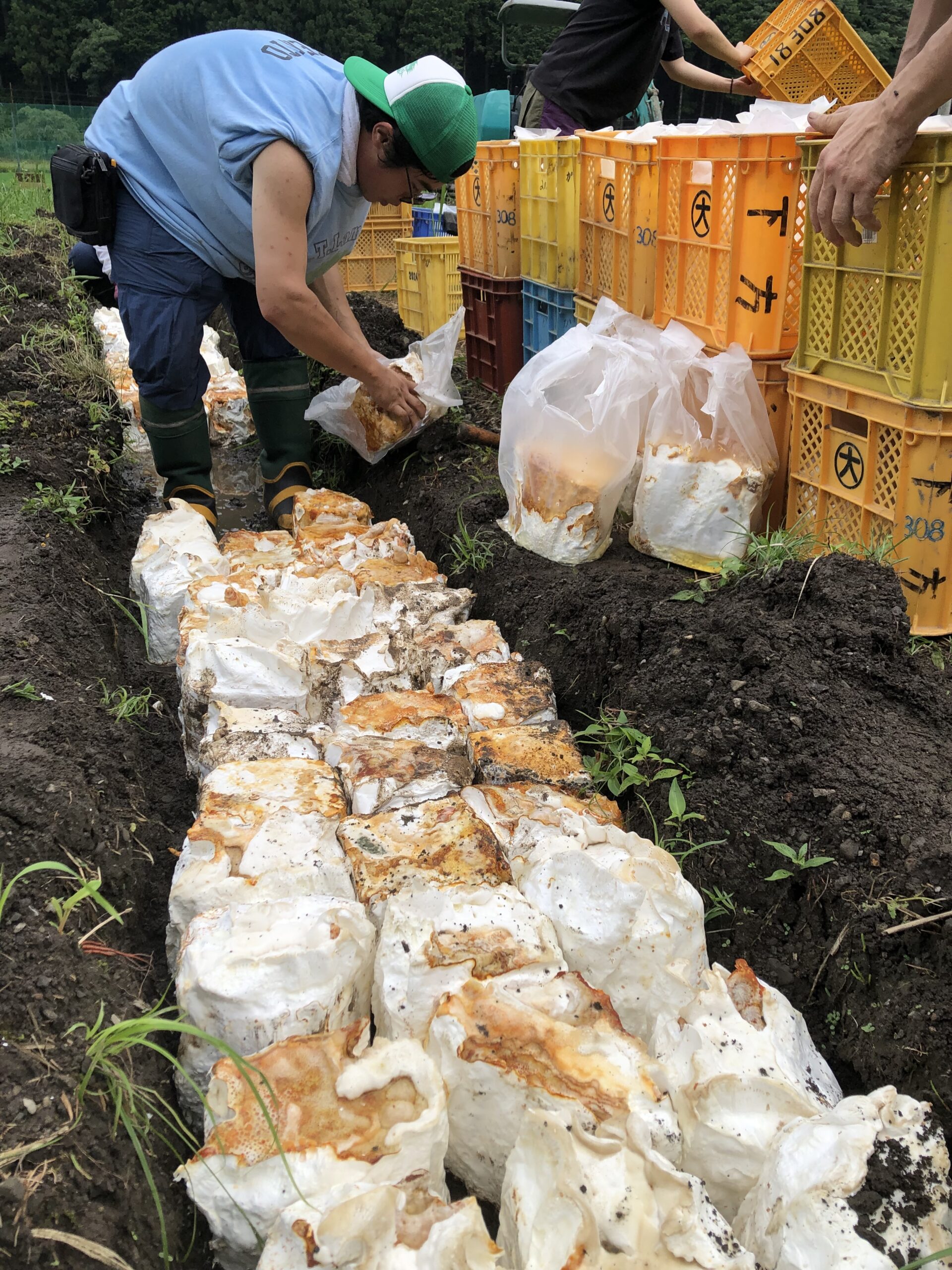 2月に植菌をしたのですが、終わった後は袋を軽く縛って室内へ移動し、しばらく培養。6月の実習の際にはカマンベールチーズのように菌が全体を覆うように回っていましたので、袋から取り出して半分土に埋めるように並べました。それから約半年…