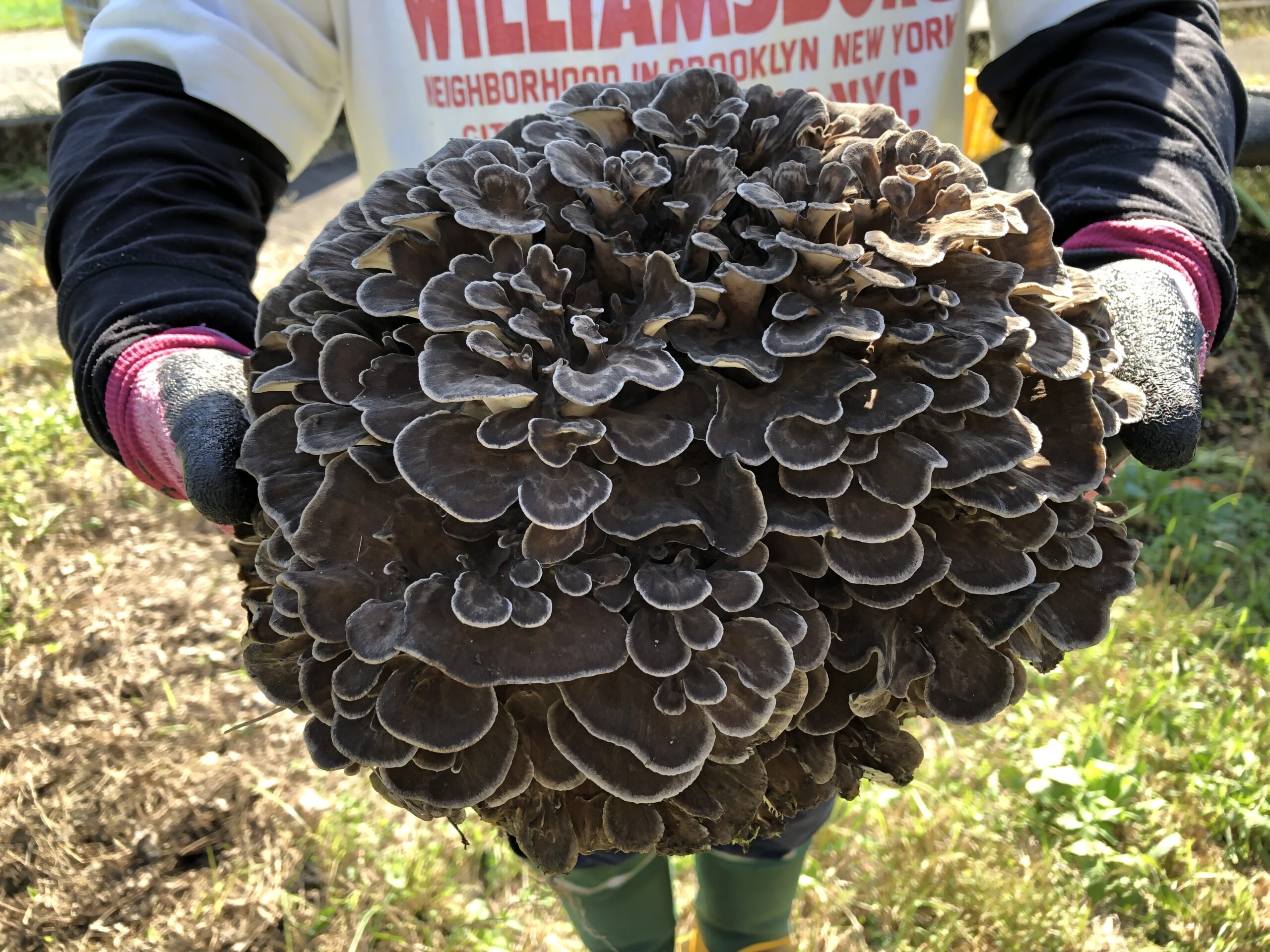 そしてさらに4ヶ月後、10月に発生の様子を観察、収穫体験もさせてもらいました。温暖化の影響かマイタケの発生シーズンが年々遅れており、実習日にマイタケの収穫ができないことが続いていましたが、今年は実習日を予め遅く設定することでようやく発生の様子を見ることができました。