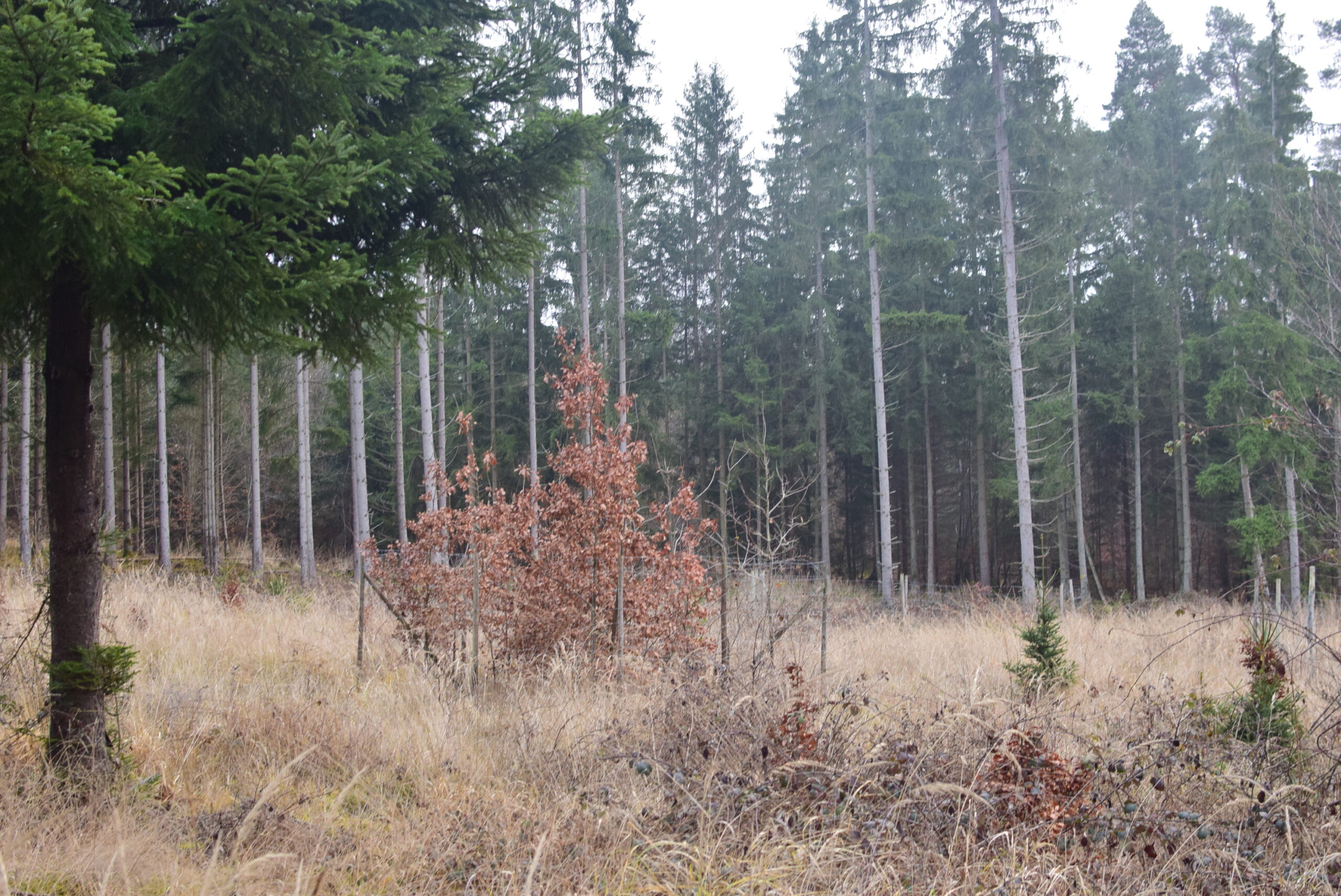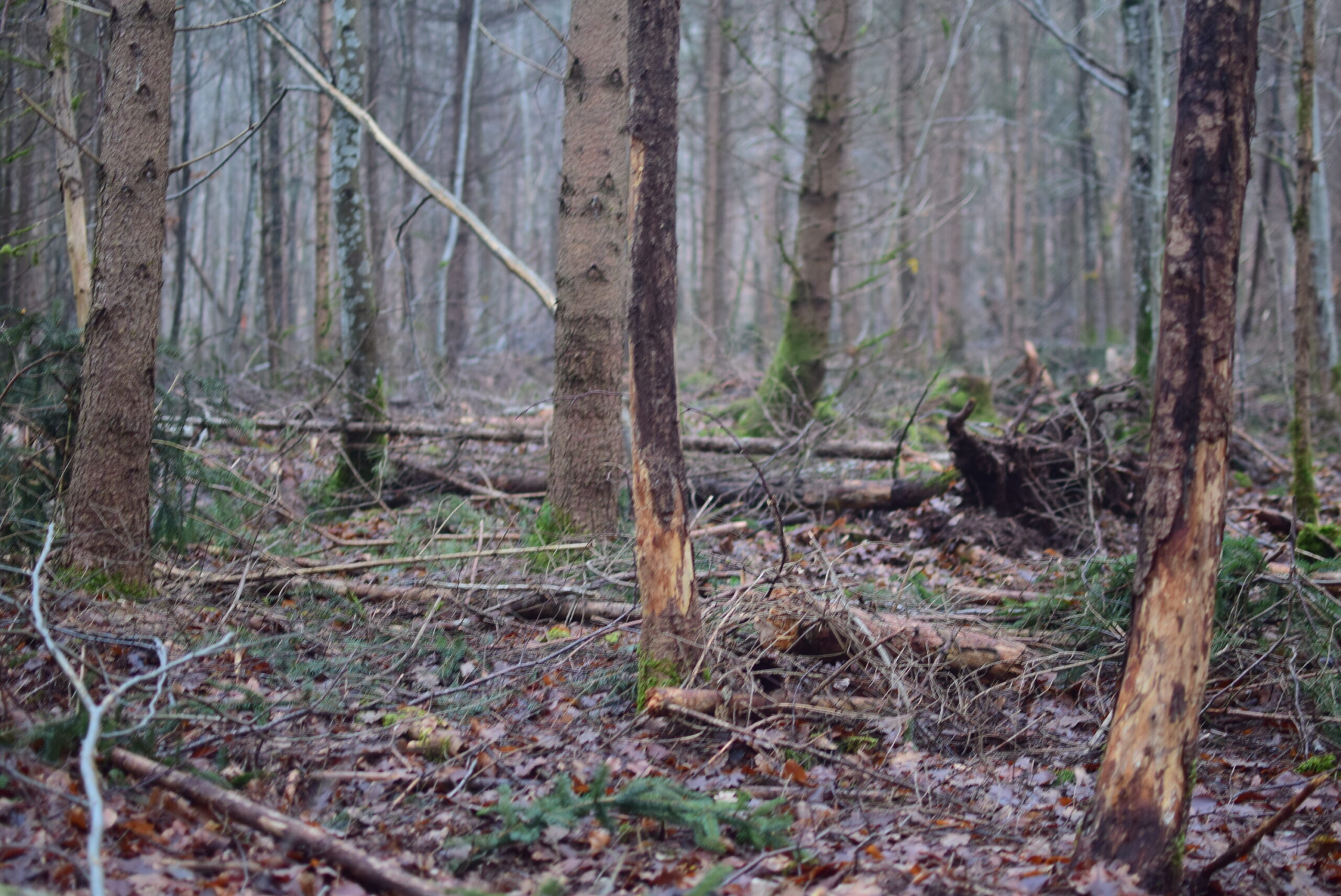 この保護区内では森林官の方が森林を管理しており、ところどころに作業道が点在していました。公園の散策道から少しだけ道を外れ、施業地がどのようなのかを見学させていただきました。ついてみると結構開けていました。 伐採して木材を出した後なのかと思っているとどうやらそういうわけでもないようで、もともとはドイツトウヒが生えていましたが、気候変動やキクイムシの侵入など、長期的、短期的な要因が重なって木が減ってしまったようです。