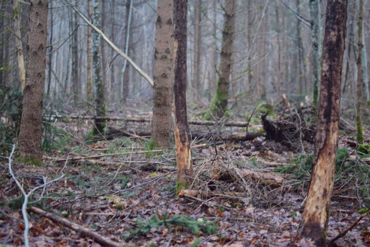 フンや捕獲した個体を検査したことでこの保護区にはおよそ450頭ものアカジカが生息していることがわかっています。アカジカはたくさん餌を食べるのでトウヒの食害どころかノロジカのいる森では見られなかったブラックベリーの採食痕まで見られました。8年前に行われた糞の解析からの調査から、現在では一番確実性があるドローンを使用し、サーモカメラで確認する方法へ変化しているようです。