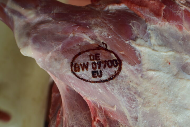 この解体処理施設は精肉や加工まで様々なことを行っています。これはEU認証をとっていなければ出来ず、冷蔵庫以外の場所でも12度以下に保つ、食肉の移動は一方通行になるようにするなどの様々な要件を満たし、衛生管理を徹底した解体処理施設なのが分かります。また、抜き打ちチェックが入ることもあるらしく常時清潔な状態を保っているそうです。ちなみにEU認証をとっていない場合ブロック分けまでしかできず、なおかつ販売するときは1頭単位で売らなければなりません。