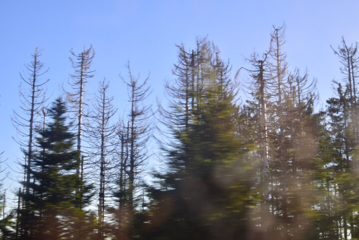 この公園の位置するシュヴァルツヴァルト(Schwarzwald)はドイツの中でも降水量が多く、かつては120日/年はスキーができたと言います。ところが、近年では気候変動の影響もあってか冬季の8日程度しかスキーが出来なくなったそうです。降水量も2,000mm/年あることで、キクイムシ被害の影響も少ないのではないかと予測していたところ、積雪が少なくなったことで保水力も落ちてしまいキクイムシの被害が多く発生しています。