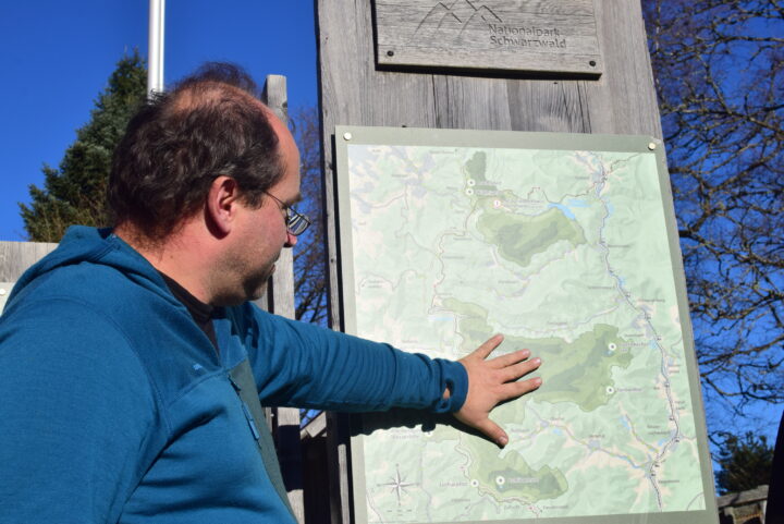 この土地の歴史と国立公園の概要を伺いました。ルーエシュタイン(Ruhestein)という地名はバーデン地域とヴュルテンベルク地域の境界を歩く人たちが岩(シュタイン)に座って休む(ルーエ)ことからついた地名だそうです。言われてみれば大きな岩が目立つ地域です。