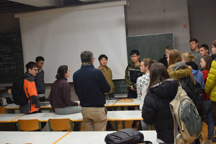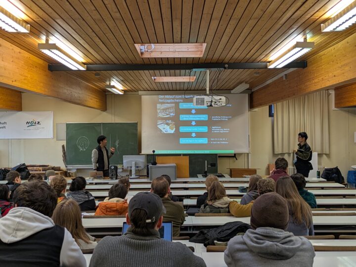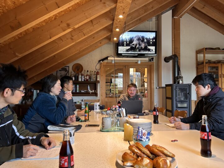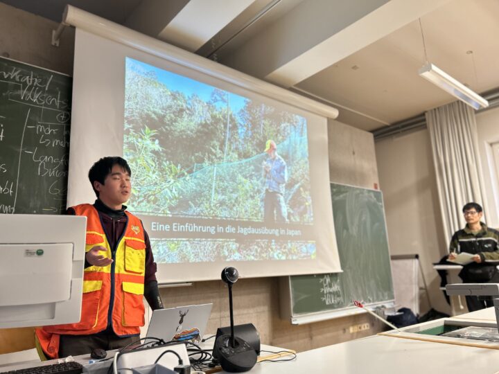 しかし、皆さんは真摯に受け止め、様々な質問をしていただきました。発表後には希望者に対してくくり罠の仮設を実演しました。終わった後にはバイムグラーベン先生からお褒めの言葉をいただき大変うれしく思いました。