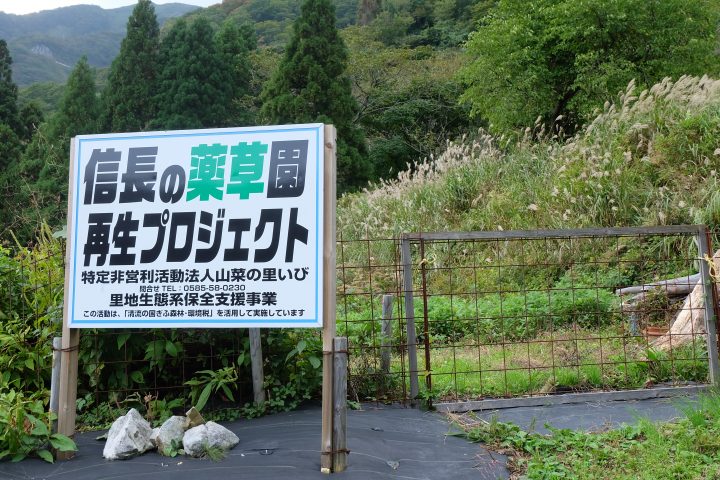 最後にお訪ねしたのは、笹又耕地の最上部で「信長の薬草園再生プロジェクト」に取り組む小寺Hさん。イブキオオヨモギ、オウレン、センキュウ、センブリ、ゲンノショウコ等の伊吹山特産の薬草を集めた畑の復活を目指し、主宰するNPOではヨモギの入浴剤や食品用パウダーの商品化を大学や企業と連携して進めておられます。