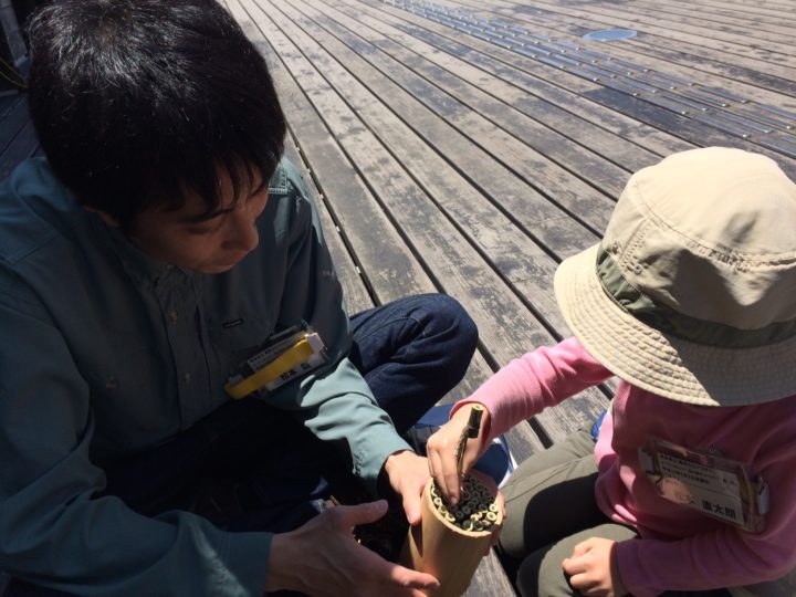 色々な虫たちが利用してくれるといいですね。次回10月の講座の際には入った昆虫たちの観察を行います。住人(住虫?)に会えることを楽しみにしていて下さい。