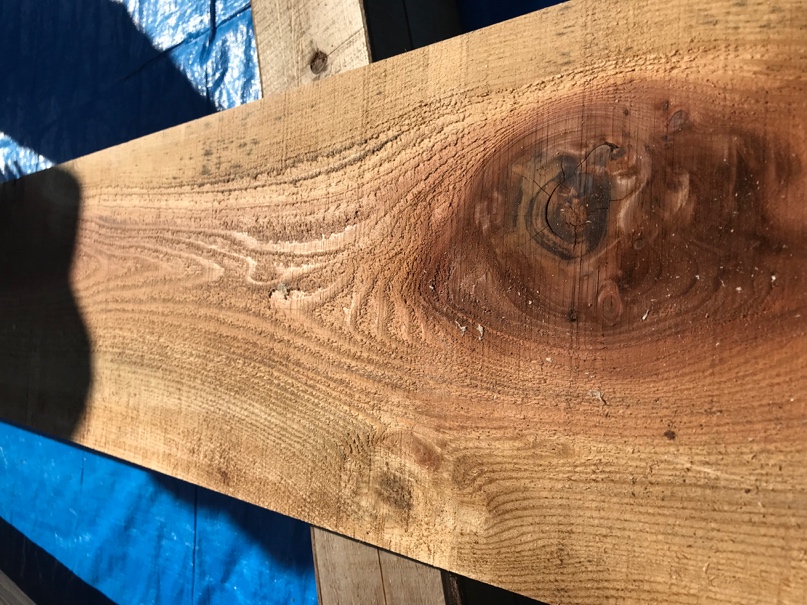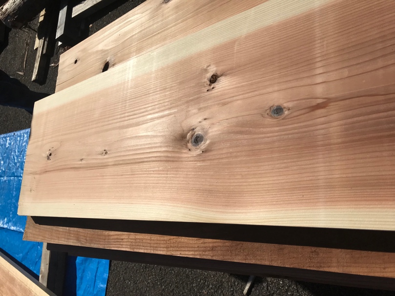 実は今回準備した木材の表面は表裏で仕上げた状態が異なっています。左の写真がかんな盤で仕上げたもの。右は丸太を製材したままの状態。仕上げるとツルツルしていて綺麗ですね。