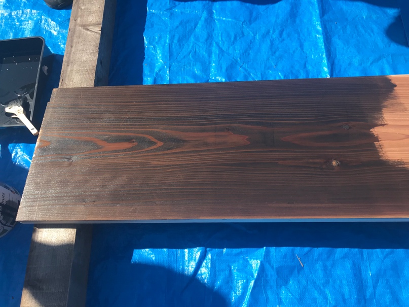 両者とも結構良い感じに発色していて甲乙つけがたいような気もしますが、今回の自力建設は製材棟ということもあり、木材に濃い黒が現れる方(右側)が選ばれました。結構ガツンと黒が入ったワイルドな風合いです。無垢の質感はもちろん良いですが、塗装されると雰囲気が変わって別の建物になる面白さがありますね。
