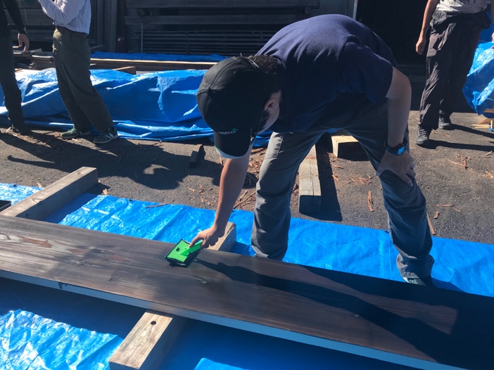 写真は心を込めて塗り込んでいる我らが棟梁。