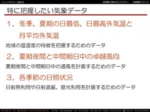 一方、高山市では、暖房が最大になってきます。日射熱をしっかり取り込んで、バイオマス等の暖房も候補に挙がってきます。