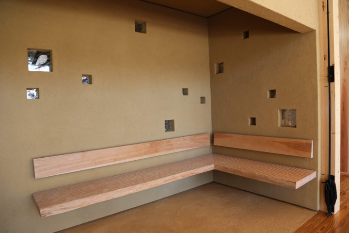 「土の洞窟」は壁も天井も床も、土を使って左官で仕上げています。ベンチがあり、座ると「垂れ壁」で少し視線が遮られることで、こもるように気持ちの落ち着く場所です。