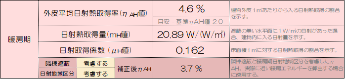 1段目のηAH値は外皮にあたる日射熱のうち平均的に4.6%分が室内に入ってくることを示しています。夏期が2.8%でしたので、1.6倍日射熱が入りやすい性能といえます。