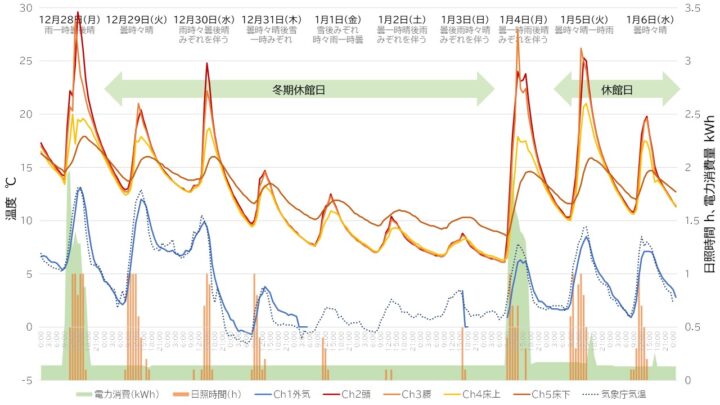 分析2として、平年並みの気温で、日射も概ね平年並みの1/4~1/6の期間。(1日目は通常利用、残り2日は建物本来の性能が見れます。)