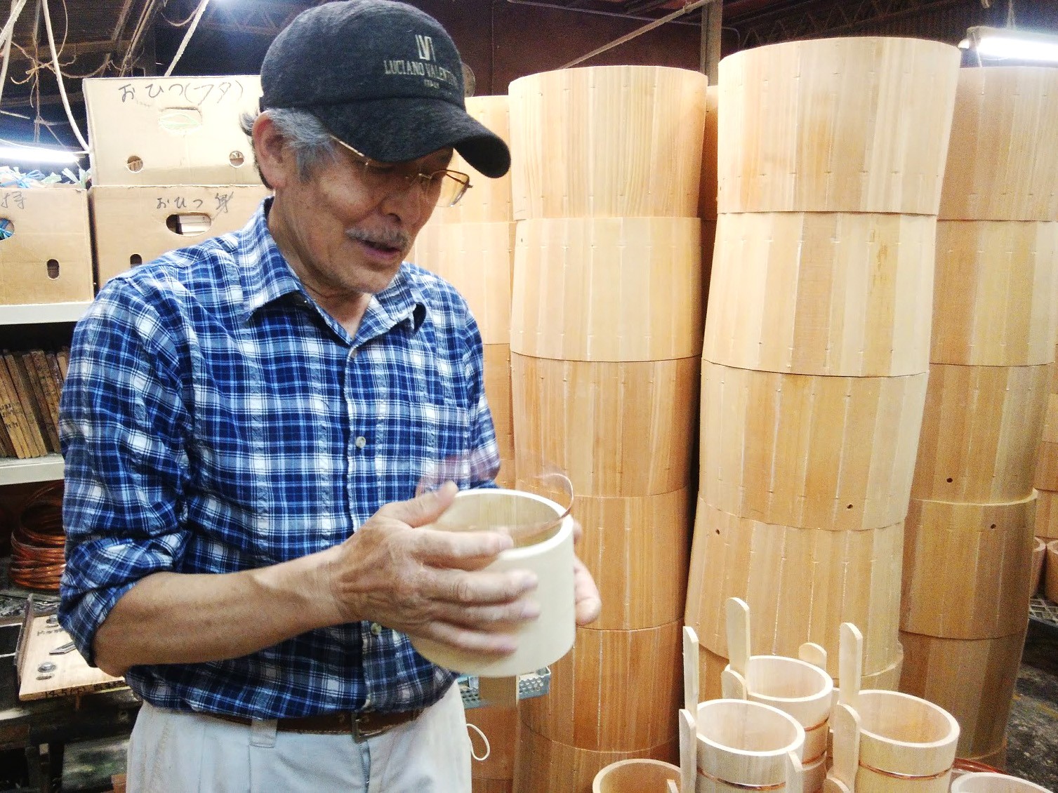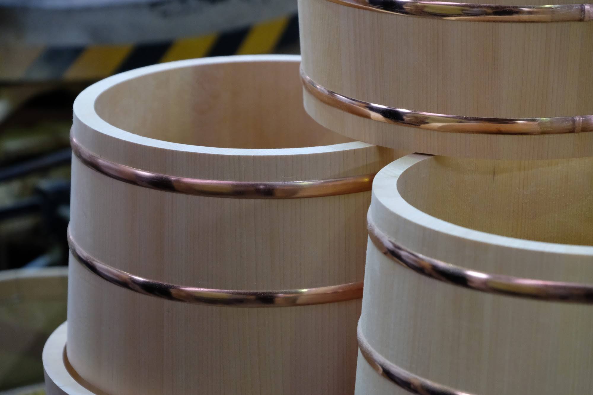 ニセン工芸は、桶・樽を受注生産で製造し、問屋卸をしている会社です。「桶と言ってもピンキリで、小さなものから1メートルもあるものまで、いろいろ作っています」とのお言葉どおり、工場内には、そこかしこに様々なサイズや形の桶製品やその過程のパーツが積み上げられていました。