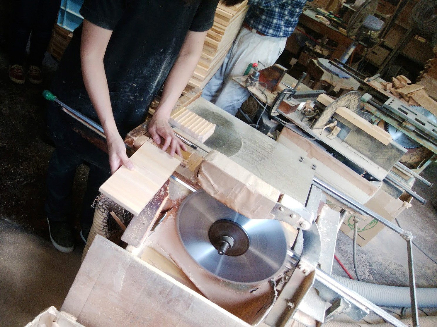 こちらは、桶の側板になる『コマ』を切り出しているところ。1個1個、角度と勾配をつけてカットしていくそうです。「自動的に全て切ることが出来る大きな機械も(他所には)あるけれど、木によって硬い、柔らかいがある。そういう木の性質にスピード等を合わせて、1枚1枚を人が切るとやはり、1番いいものができます」