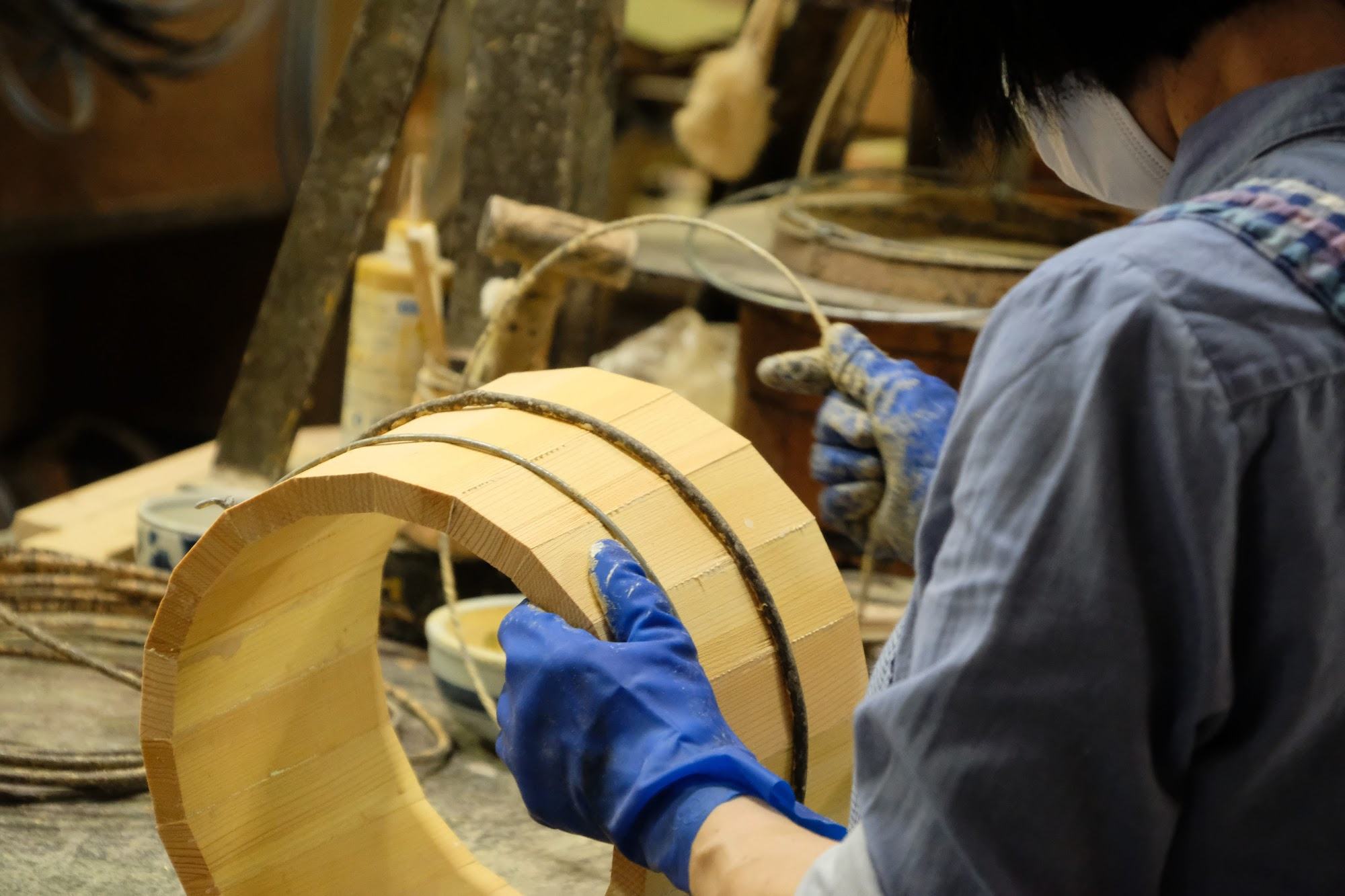 『コマ』にボンドをつけたものを仮のタガに添わせて桶の形に組み、乾燥させます。