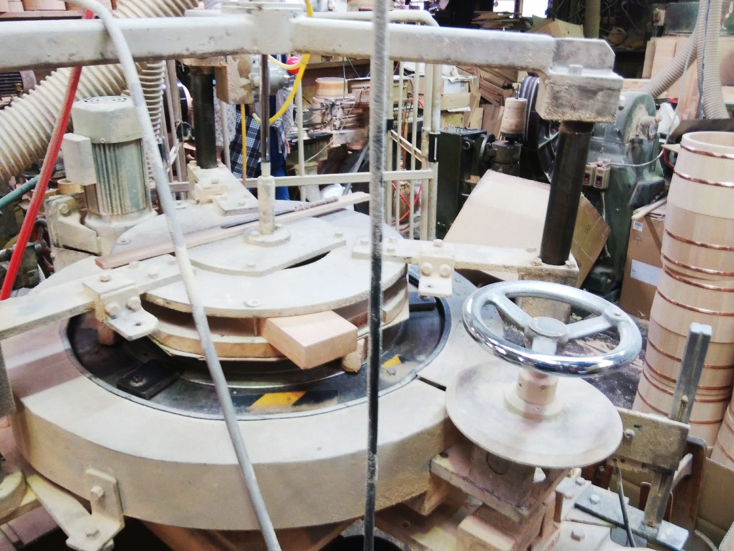 私達が事例調査で木工所を見学させていただく際は、授業で操作したことがある機械を見ると安心し、まだ知らない機械があると「何に使うものだろう」と興味津々になる、という傾向があるのですが、いずれにせよ、”世の中にはこういう機械が売られている。もし自分がその機能が必要になったら、この機械を入手して使うのがよい”と頭のなかにメモしているような気持ちがありました。ところが、こちらのニセン工芸においては、全ての機械が、桶制作のためのオリジナル。治具のみならず、木工機械自体も必要に応じて試行錯誤し、開発してしまう軽やかさに、目から鱗が落ちる思いでした。