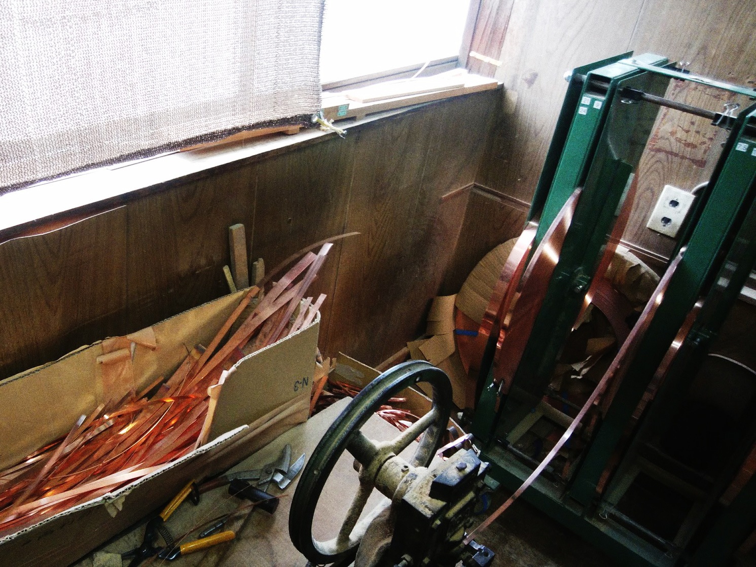 銅タガについても、平の銅を仕入れてこちらの工場内で、さまざまなサイズの桶にあわせたタガに溶接して仕上げているとのこと。さまざまな幅のテープ状の銅板を必要な長さにカットし、銀蝋で溶接してタガにしているそうです。