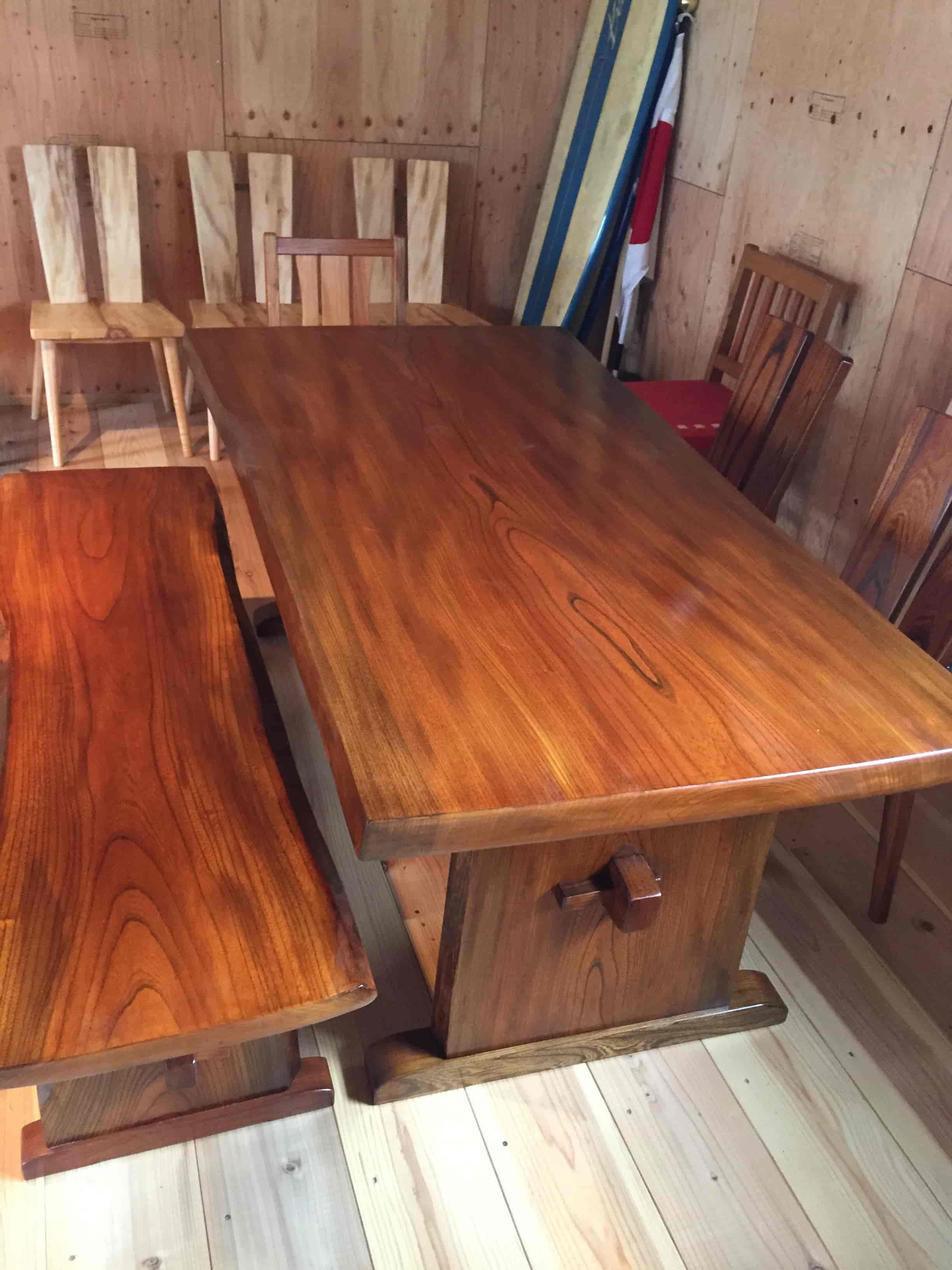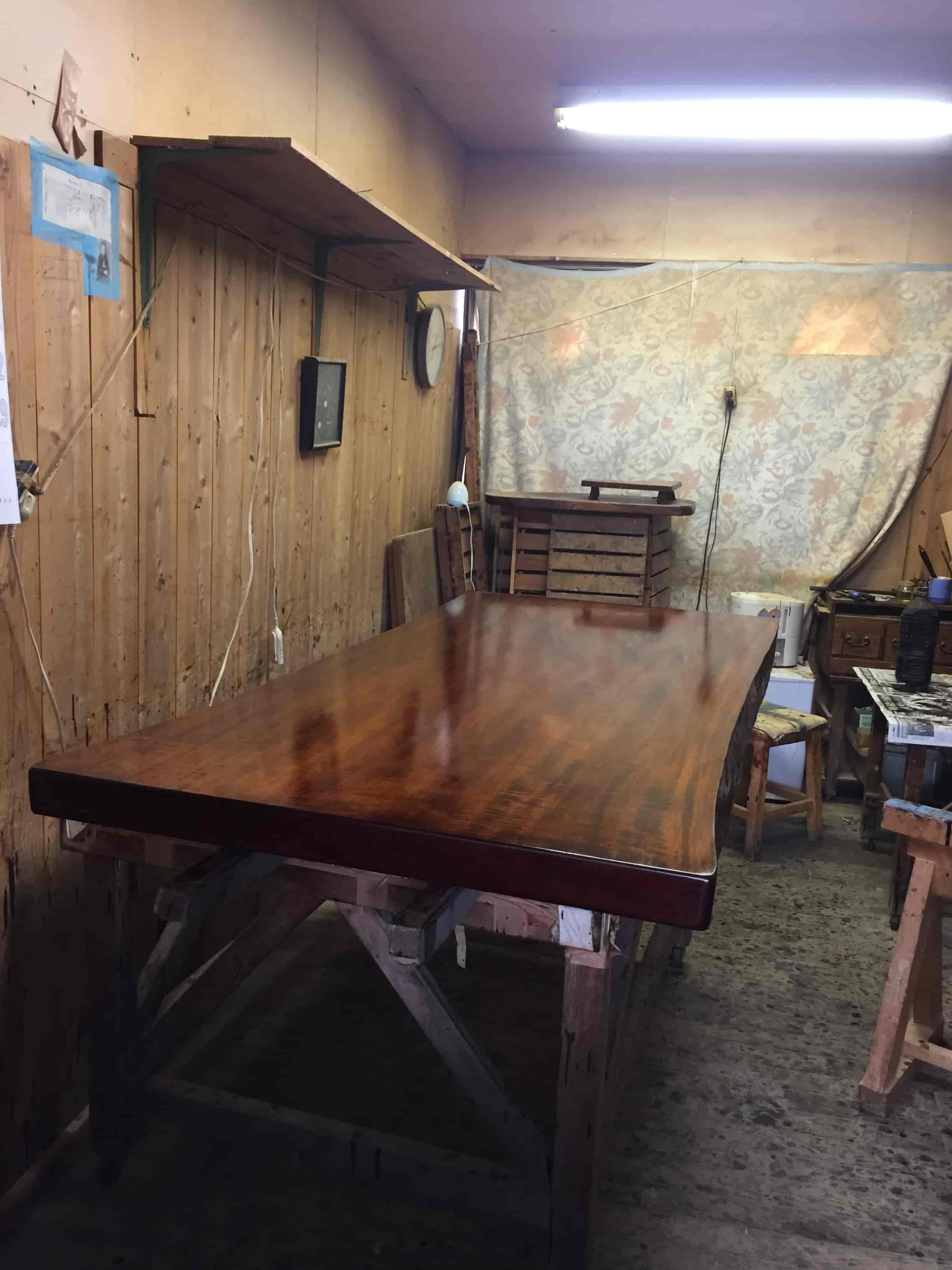 他との違いをつけているのは何も仕入れの方法だけではありません。「白山クラフト」の大きな特色として、一枚板のテーブルに漆塗装を施した製品があります。漆の塗装作業はとても手間と時間のかかる作業で、一枚板の大きなテーブルに塗装を施すのは簡単な仕事ではありません。しかし松井さんは、入念に漆を塗り、拭き残しのないよう丹念に拭き取るという作業を6度も行うこの工程を、無心になって製作に向かえる時間としてとても大事にされているそうで、それゆえに最も楽しい作業であると仰っていました。だからこそ、松井さんの作る作品はとても丁寧で、綺麗な仕上がりなのだろうと思いました。