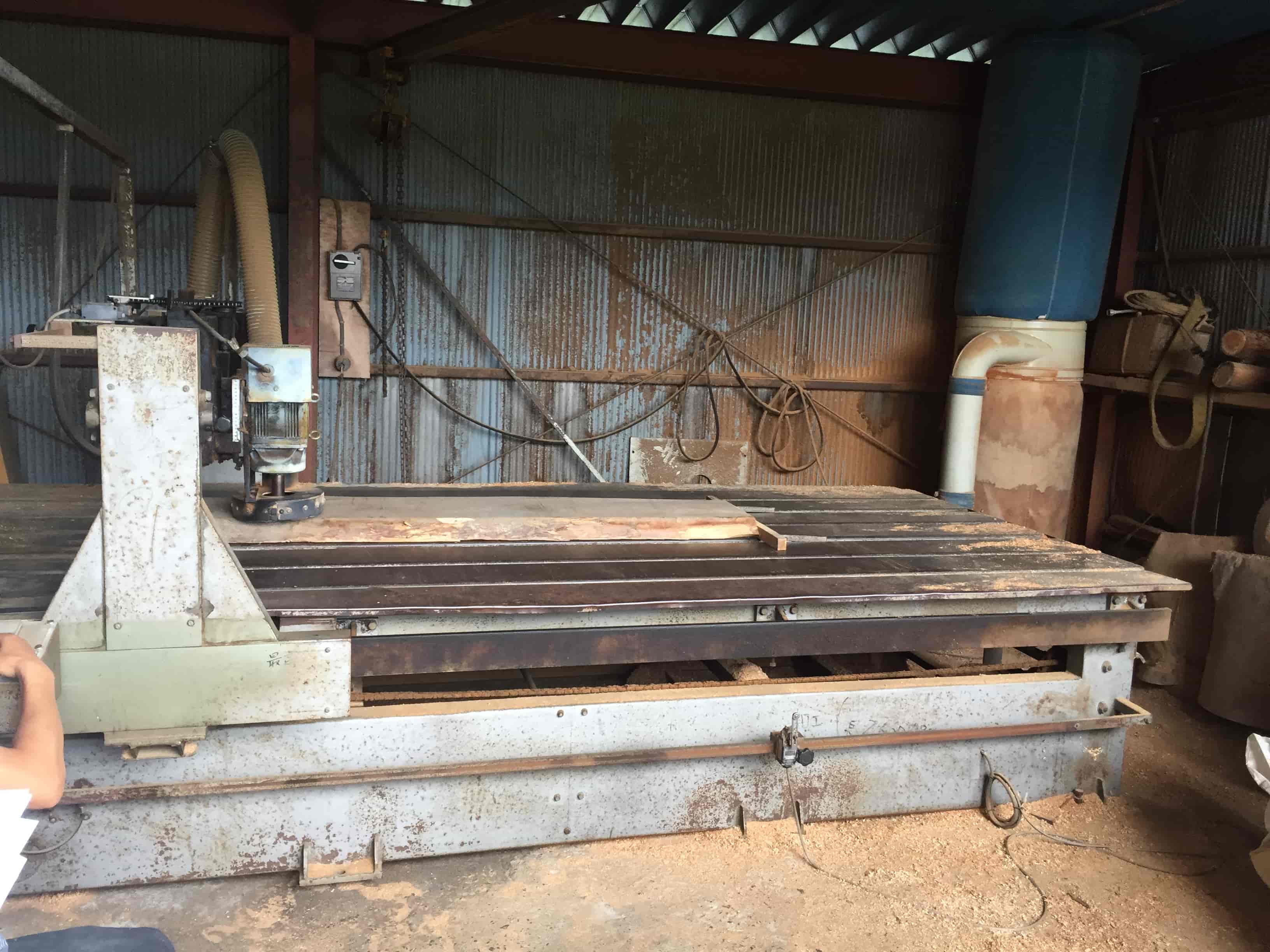 まずはじめに松井さんに案内していただいたのは「白山クラフト」の製品が生み出されている工房です。実際に中に入ってみると、その広さと、設備の充実度に一同驚きを隠せません。詳しくお話しを伺ったところ、その工房はもともと松井さんが社員として働いていた民芸家具を制作していた会社の工房で、親方がやめられた際に、工房を丸々譲っていただいたのだそうです。その前身となる会社の規模が、従業員数で最大15名ほどであったとか。道理で加工機械の種類が豊富だなぁ、と思っていると松井さんは中でもとっておきの機械があるんだ、と我々を外へと案内してくださいました。