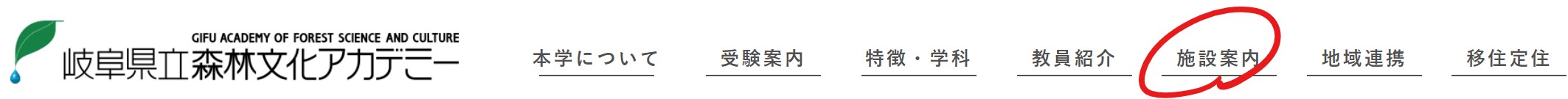 今年度、ホームページのさらなる充実に取り組んでおり、その一つが、上部メニューの「施設案内」から入れる「森林文化アカデミー施設概要」です。