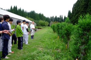 10月4日にエンジニア科1年生の実習「林木育種・育苗」で,郡上市白鳥の岐阜県白鳥林木育種事業地の見学に行ってきました。ここは3つある岐阜県の育種事業地の中で最も面積が大きく,ヒノキやスギ,アカマツ,クロマツの採種園やスギの採穂園などがあります。この育種事業地の管理をしている霞さんに案内・解説してもらいました。